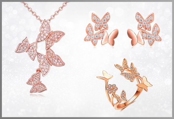 Feel as free and as beautiful as a butterfly with this gorgeous fluttering set! Bundle includes a necklace, earrings, and ring featuring rose gold butterflies, studded with cubic zirconia crystals.