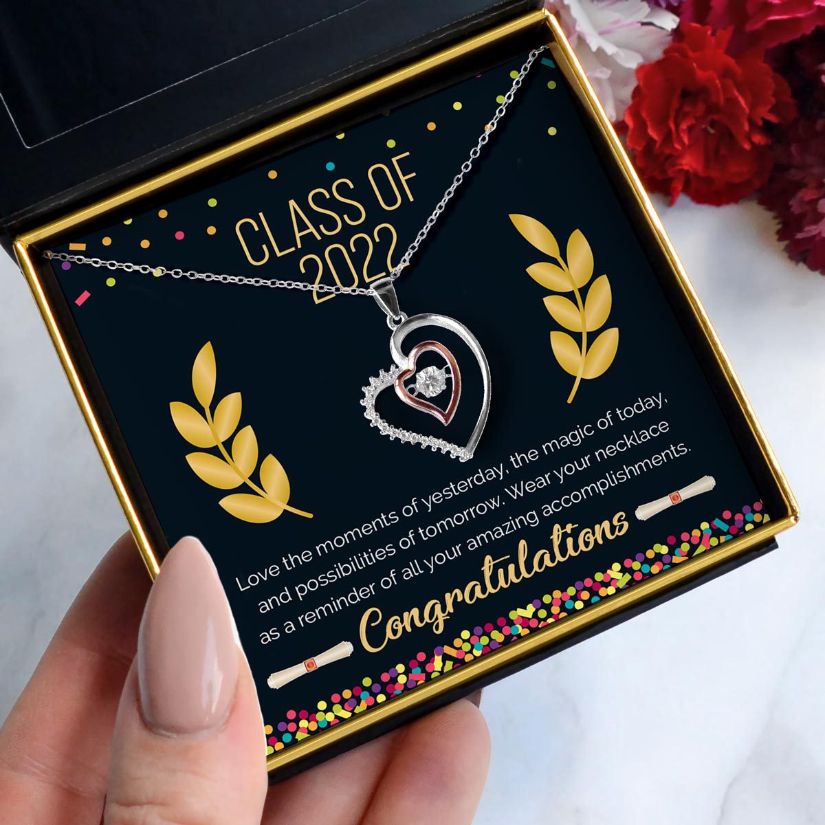 - Card reads "Class of 2022 - Love the moments of yesterday, the magic of today, and possibilities of tomorrow. Wear your necklace as a reminder of all your amazing accomplishments. Congratulations!"