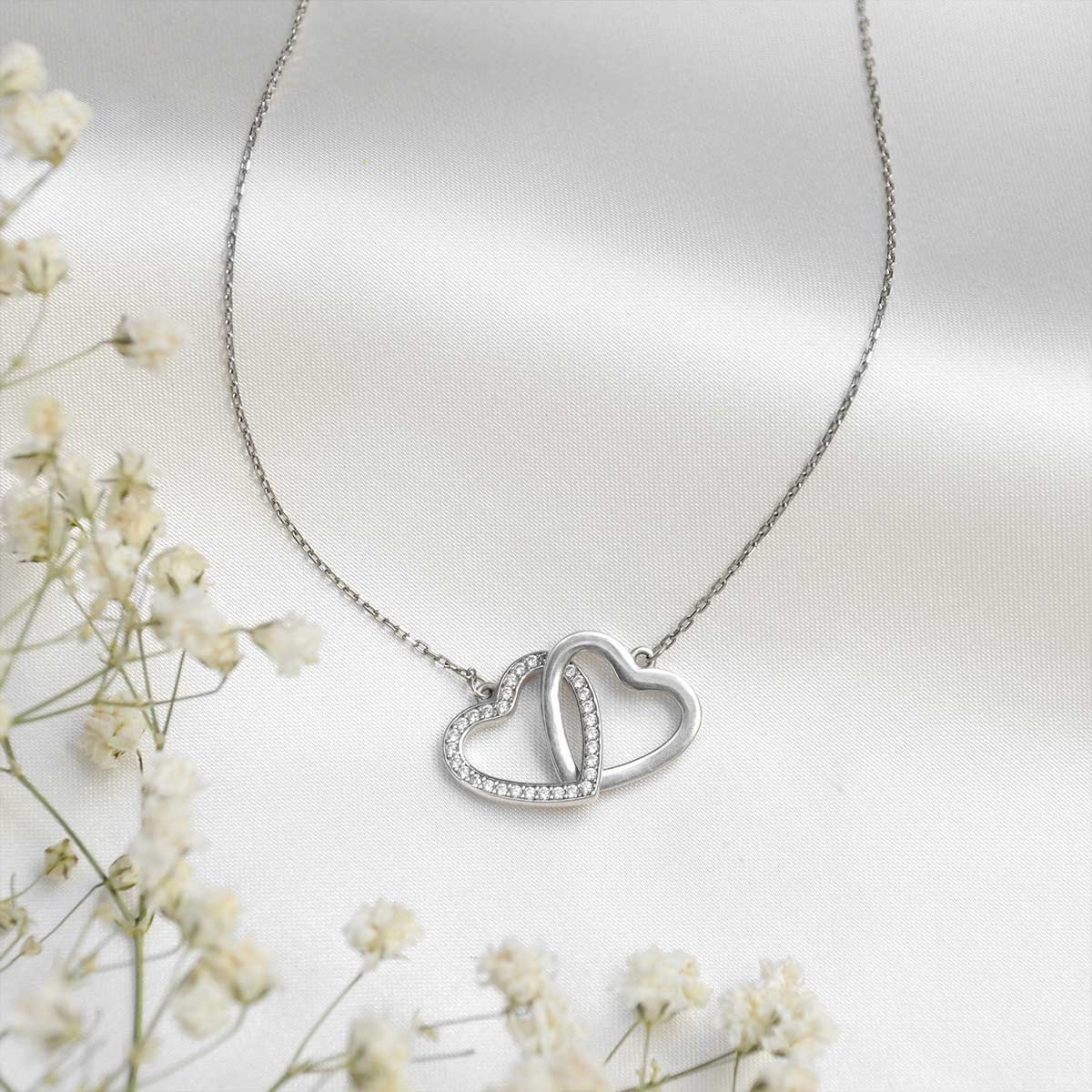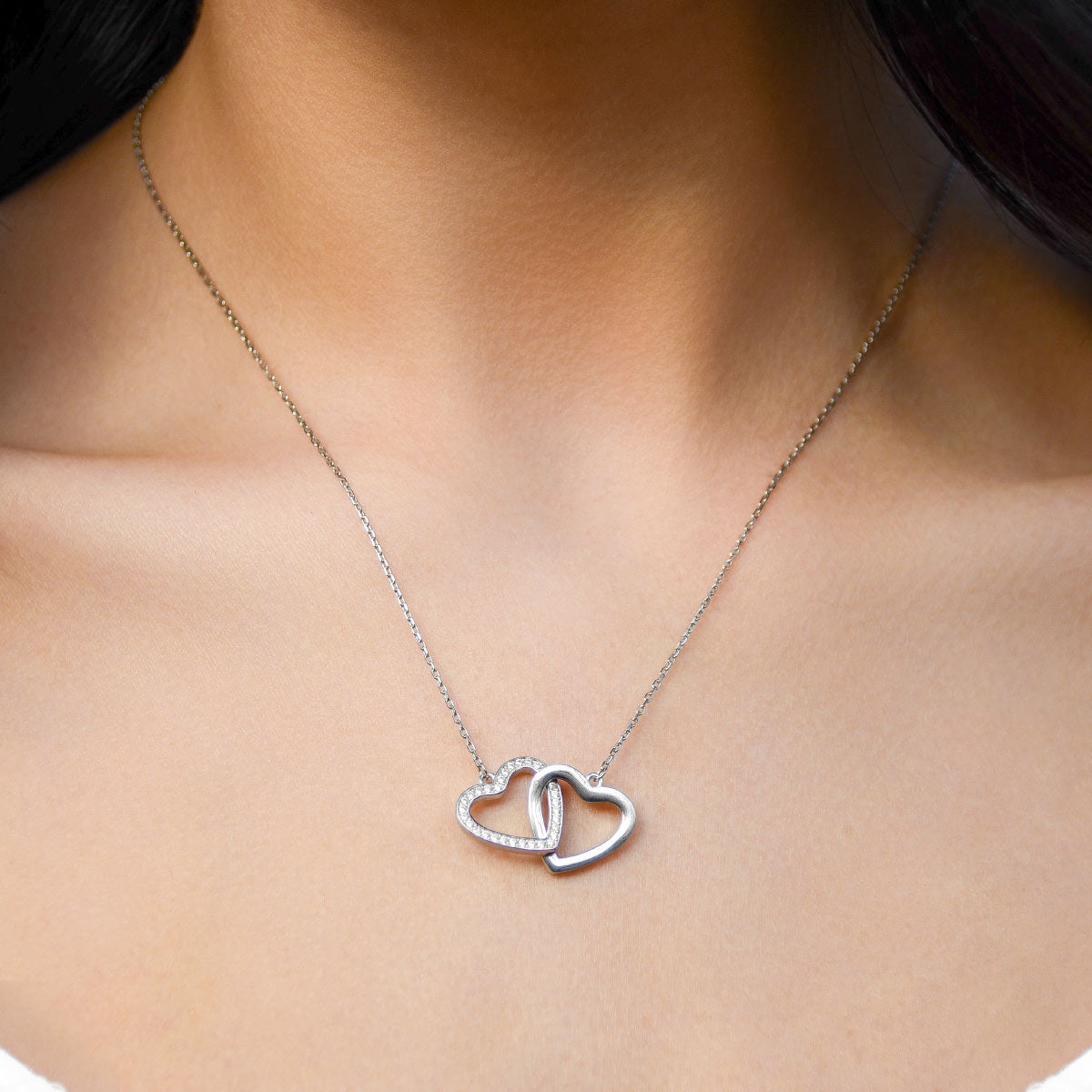 - Design: Two hearts interlocked hearts with CZ crystal accents