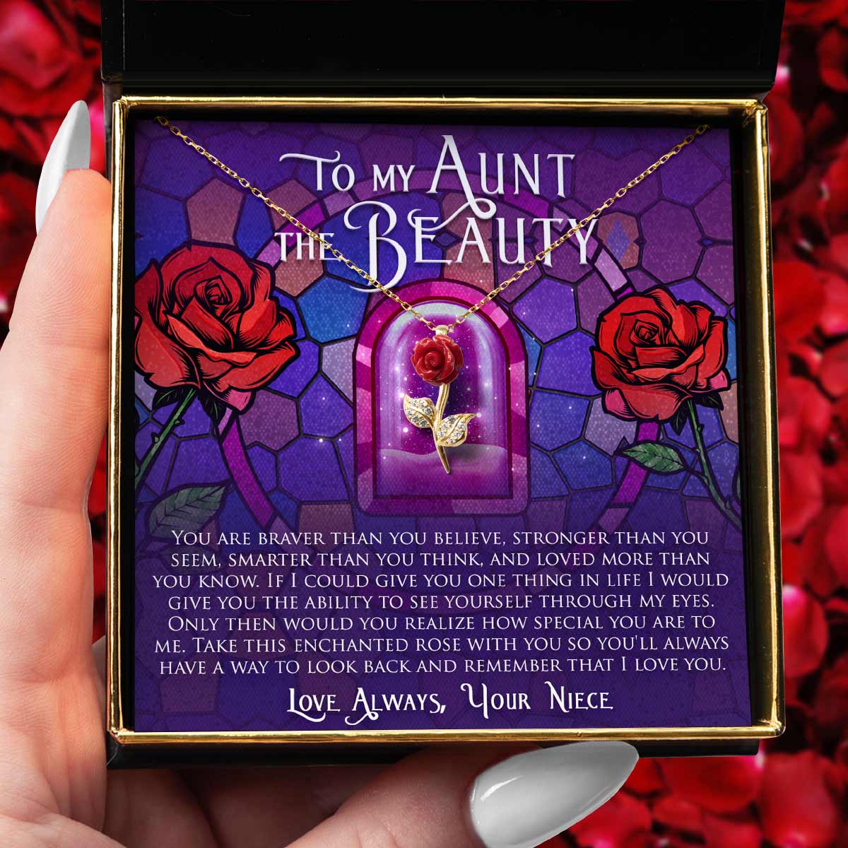 A gorgeous story book themed gift for your aunt from her beloved niece! This enchanted rose gift set is a reminder of love & courage that she can cherish every single day. This gift set includes a crystal encrusted red rose necklace with a heartfelt message card. Your necklace will arrive in an exclusive black and gold gift box with a certificate of authenticity - ready to be gifted!