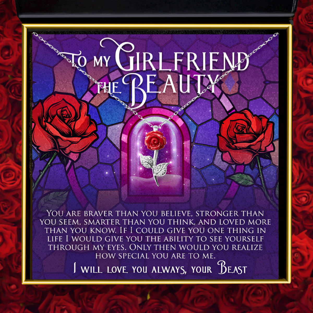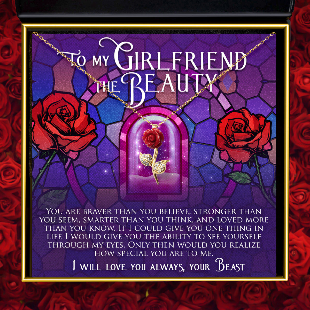 - Card reads "To My Girlfriend the Beauty, You are braver than you believe, stronger than you seem, smarter than you think, and loved more than you know. If I could give you one thing in life I would give you the ability to see yourself through my eyes. Only then would you realize how special you are to me. I will love you always, your Beast."