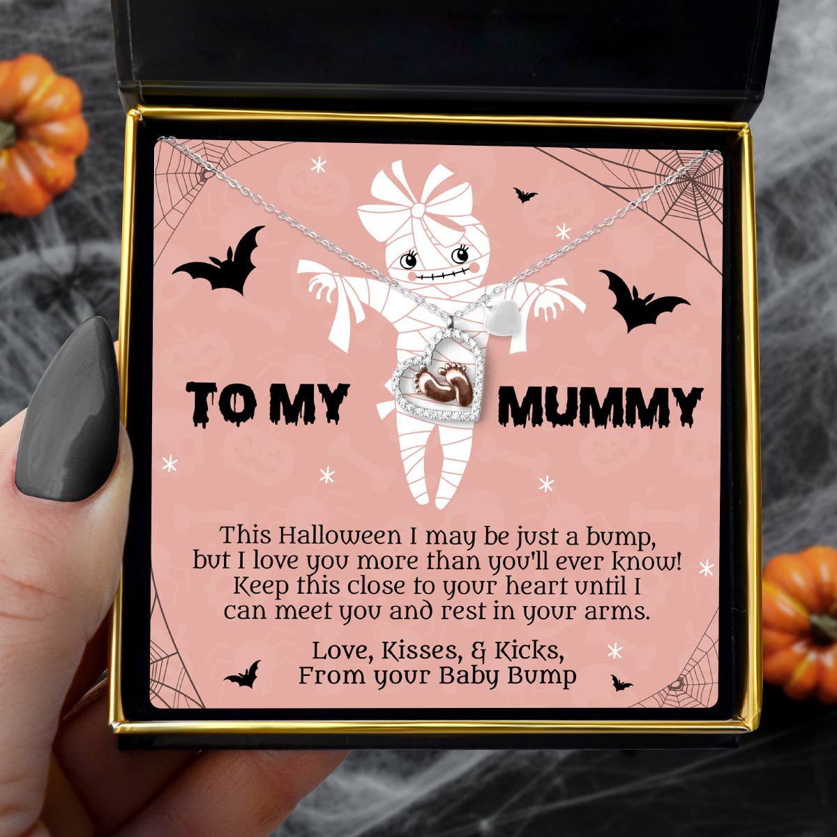 - Card reads "To My Mummy - This Halloween I may be just a bump, but I love you more than you'll ever know! Keep this close to your heart until I can meet you and rest in your arms. Love, Kisses, & Kicks, From your Baby Bump"